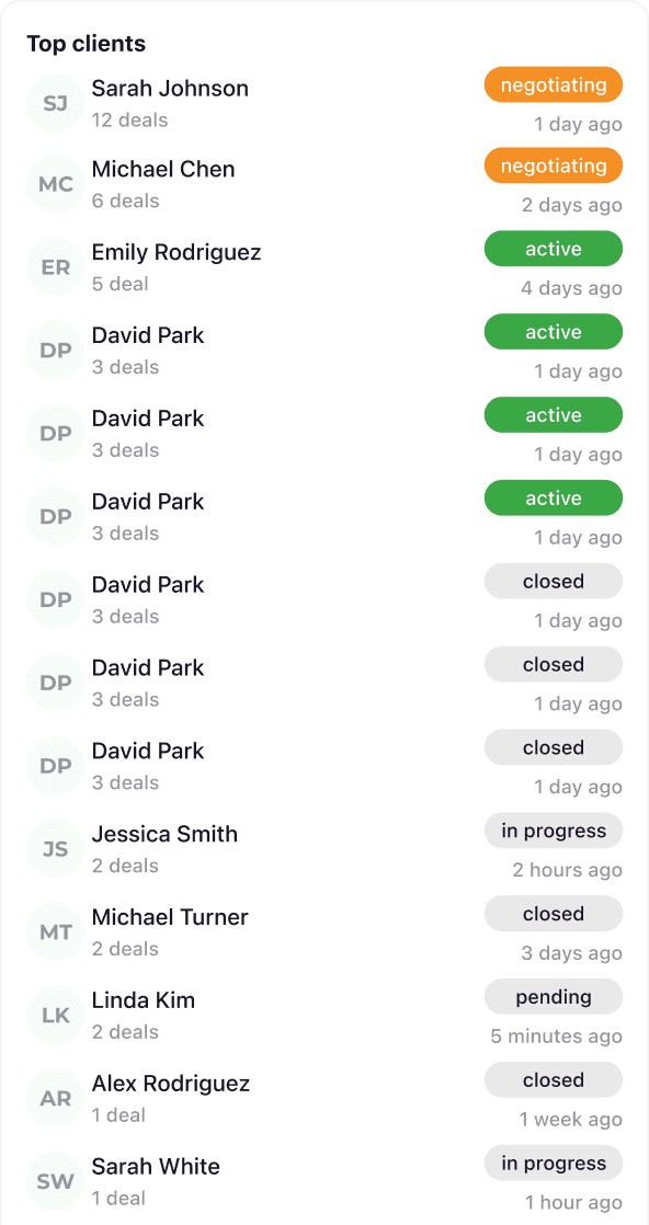 Increase conversion from inquiry to deal by keeping active leads, meetings, and hot listings in one clear pipeline.