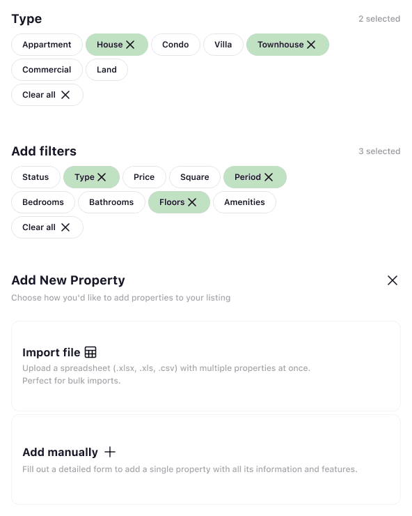 simple filters and modals so agents can add and update listings without getting lost in complex CRM logic