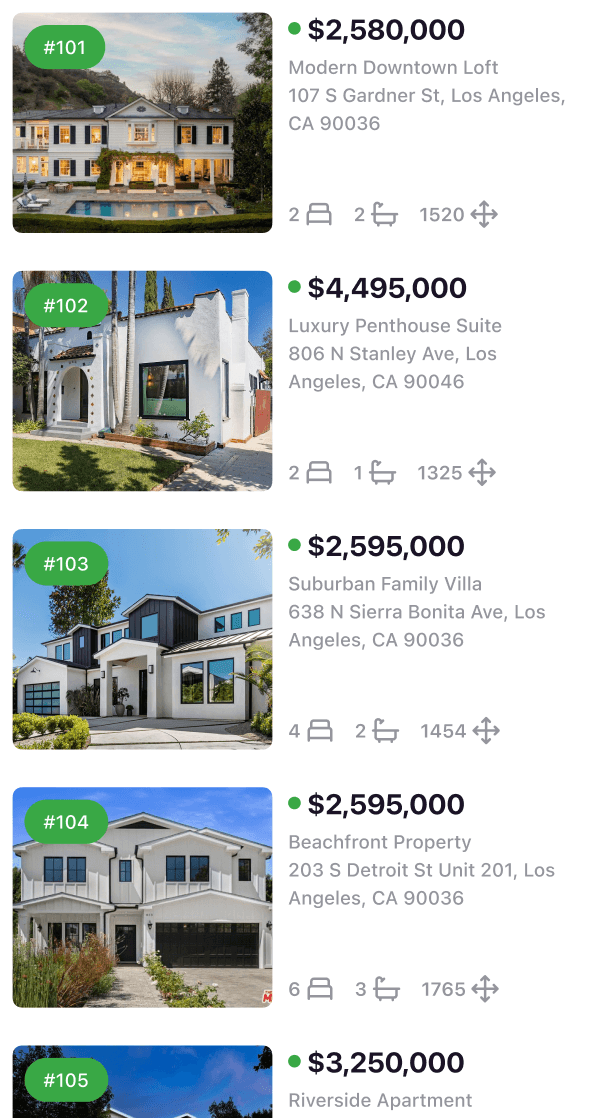 All properties live in a dedicated Properties area where the agent can see their entire portfolio at a glance. The table layout focuses on what matters day-to-day: price, status, location, bedrooms, last update, and basic performance. Sorting and quick filters help to instantly jump from “all listings” to “only active apartments in the city center”.